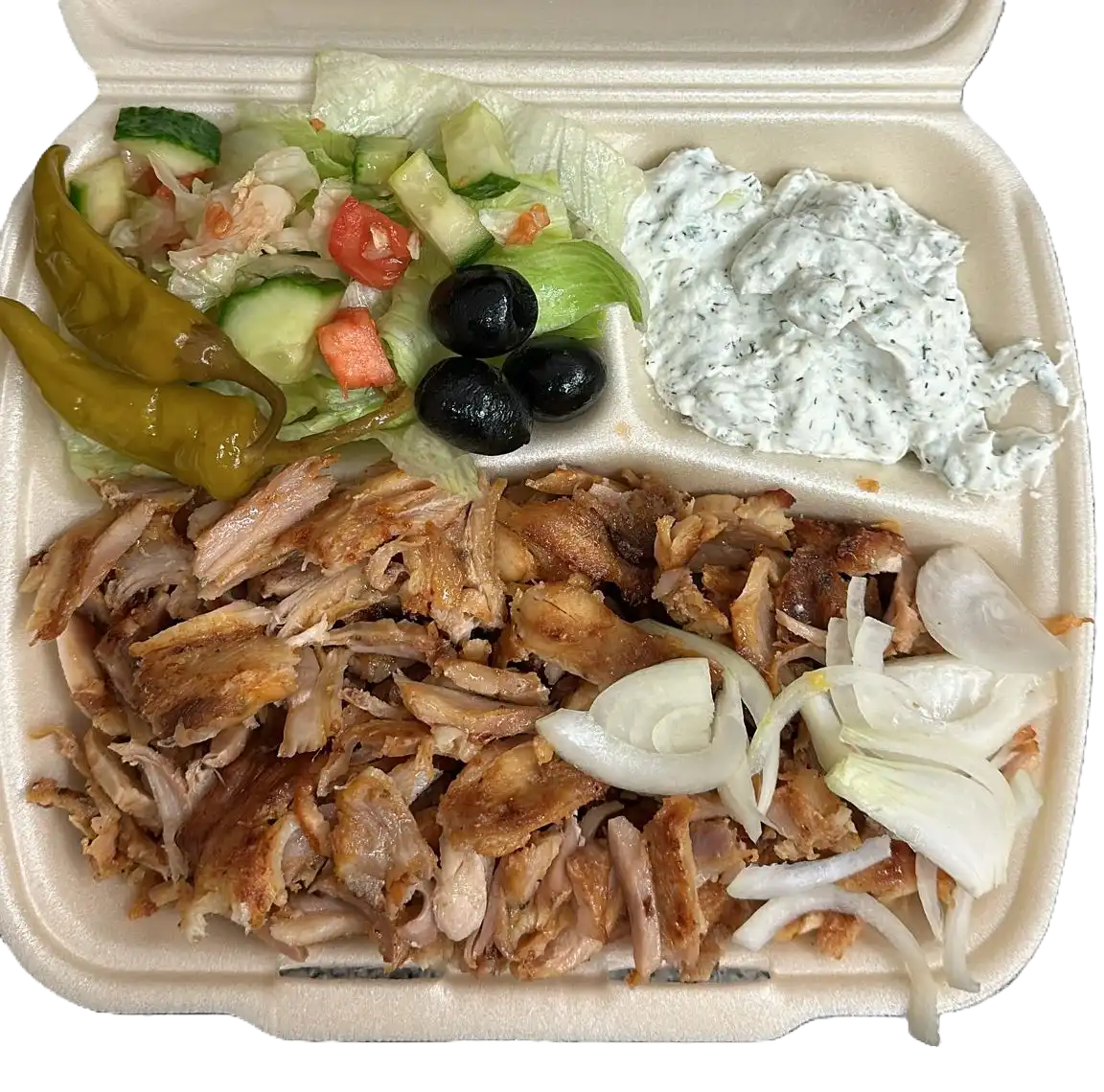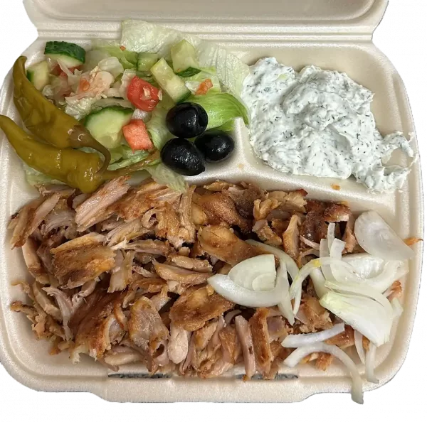 Döner-Teller mit Krautsalat, Tomaten, Gurken, Tzatziki und Pommes oder Kroketten enthält 20, A, G, K