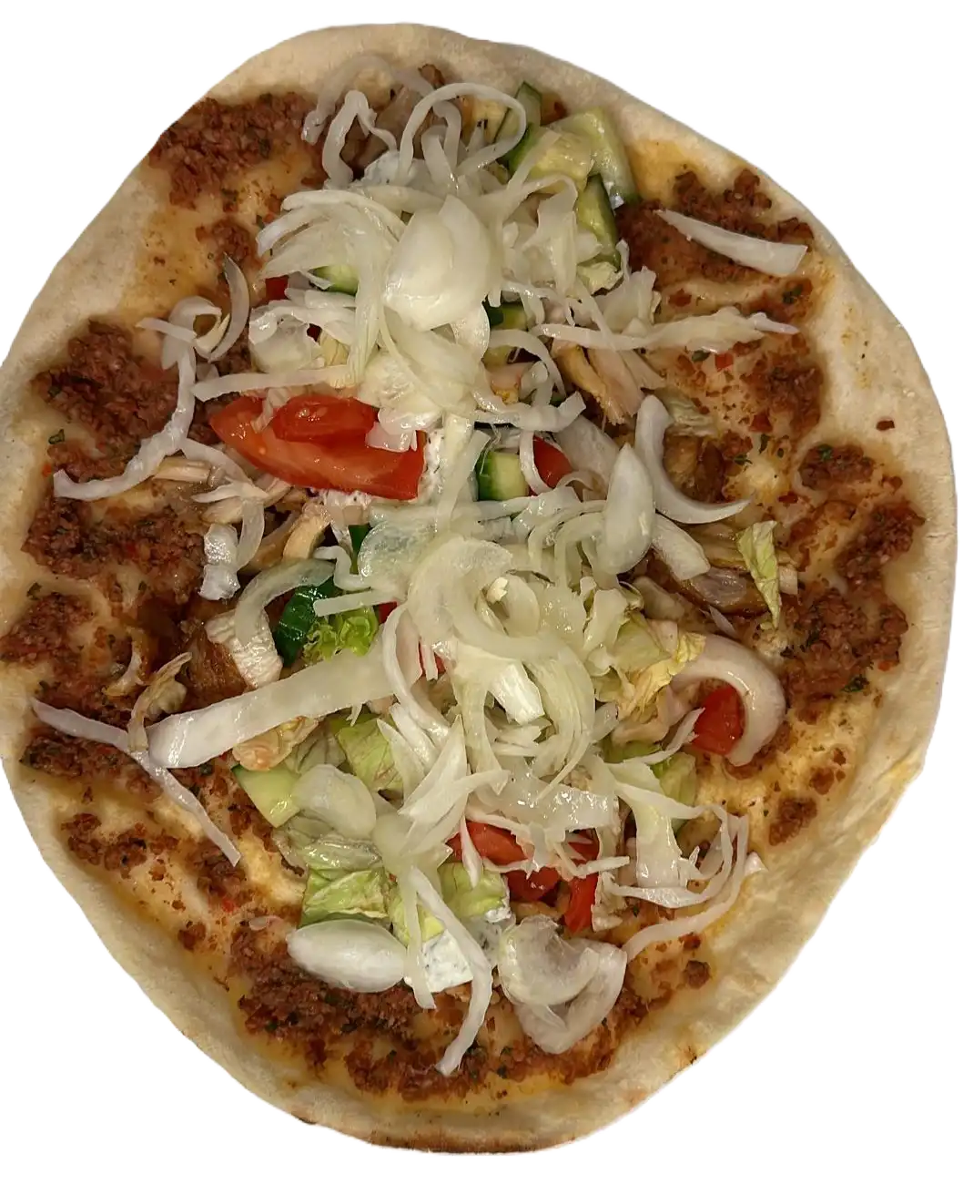 Lahmacun Döner türkische Pizza mit Döner, Tzatziki und Salat enthält 20, A, G