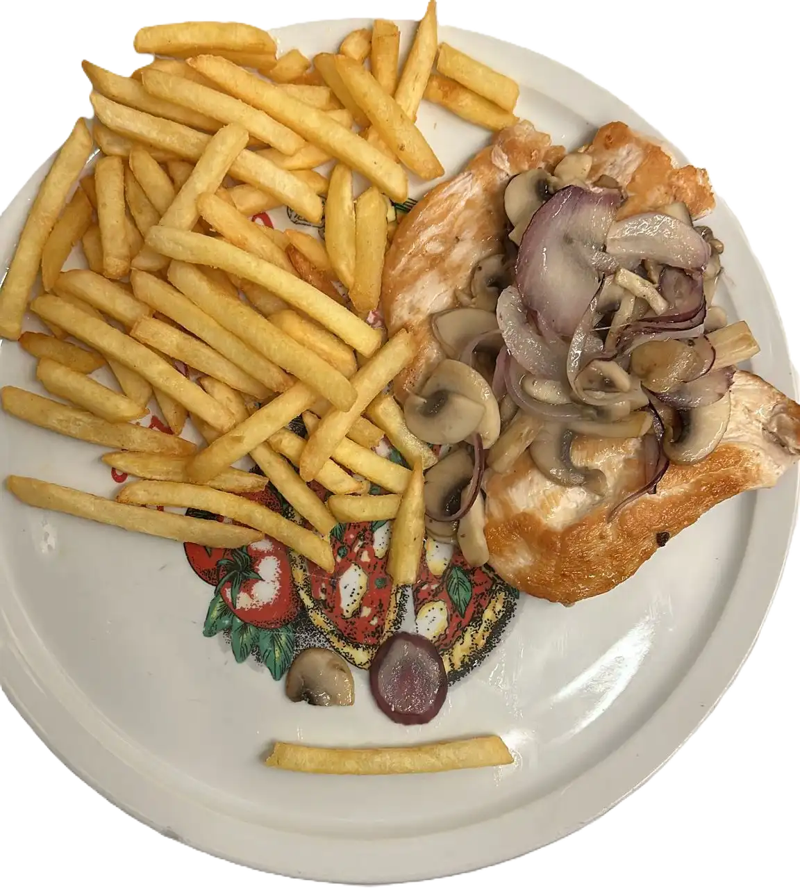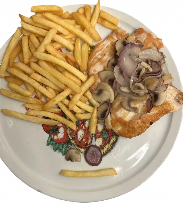 Hähnchen al Funghi mit Hähnchenfilet natur gebraten mit frischen Champignons und Zwiebeln dazu Pommes oder Kroketten enthält: A