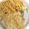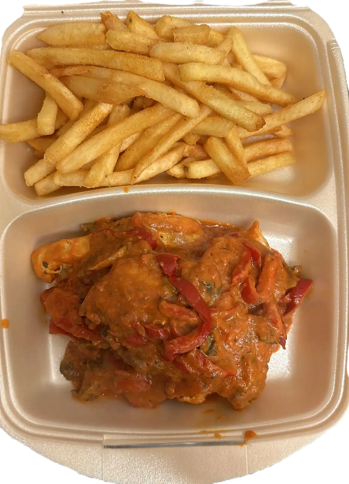 Hähnchen Löhne mit Paprika, frischen Champignons und Tomatensauce dazu Pommes Frites oder Kroketten enthält: A, G