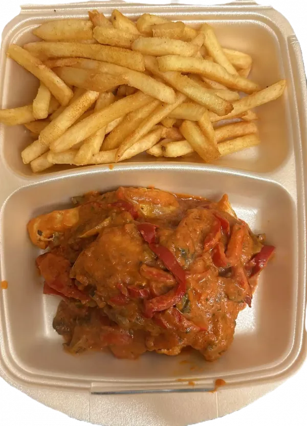 Genießen Sie unser köstliches Hähnchen Löhne, zubereitet mit frischen, knackigen Paprika, saftigen, aromatischen Champignons und einer besonders leckeren, reichhaltigen Tomatensauce, die dem Gericht eine unverwechselbare Note verleiht. Dazu servieren wir Ihnen knusprige, goldbraune Pommes Frites oder köstliche, handgemachte Kroketten, die perfekt als Beilage passen. Dieses wunderbare Gericht ist nicht nur ein Genuss für die Sinne, sondern auch eine echte Gaumenfreude, die für jeden Geschmack etwas zu bieten hat und die Sie garantiert begeistern wird. Lassen Sie sich von unserer Leidenschaft für gutes Essen mitreißen und erleben Sie einen kulinarischen Höhepunkt, der Ihnen noch lange in Erinnerung bleiben wird.