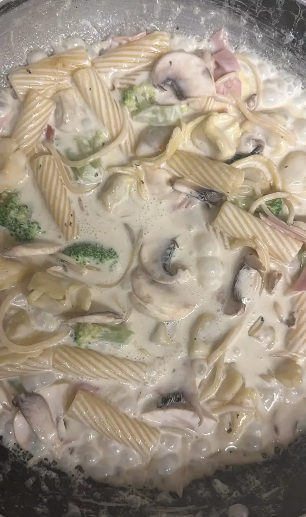 Pasta Tri Mista mit drei Nudelsorten, Schinken, frischen Champignons, Broccoli und Sahnesauce enthält: 1, 2, 3, A, G