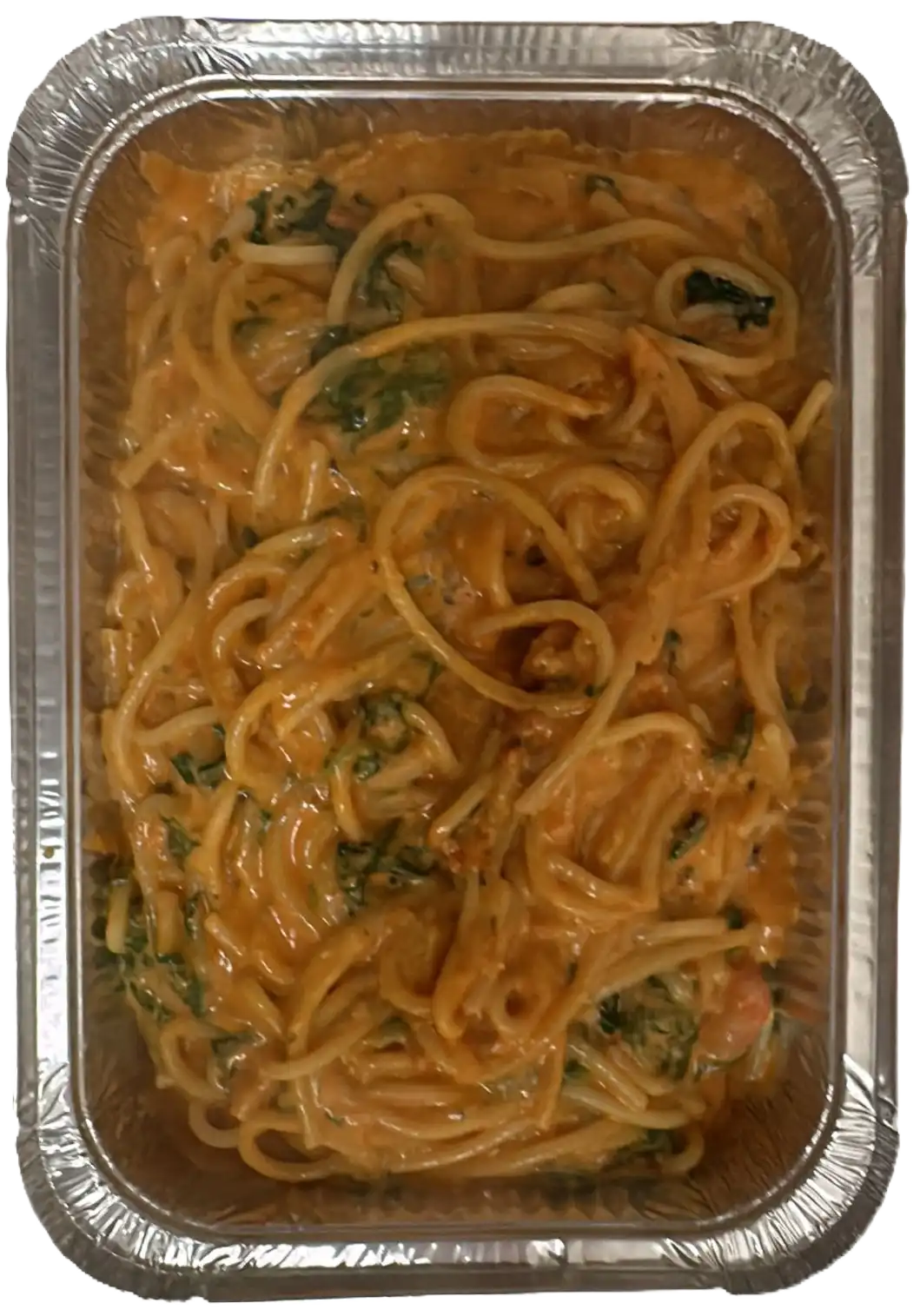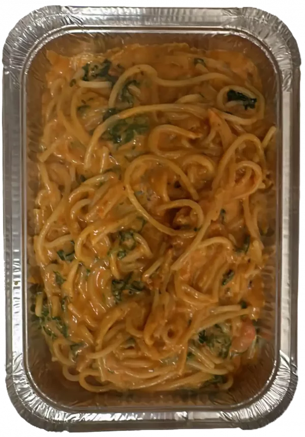 Spaghetti Scampi mit Spinat, Knoblauch, Scampi und Tomatensauce enthält: 1, A, B, G