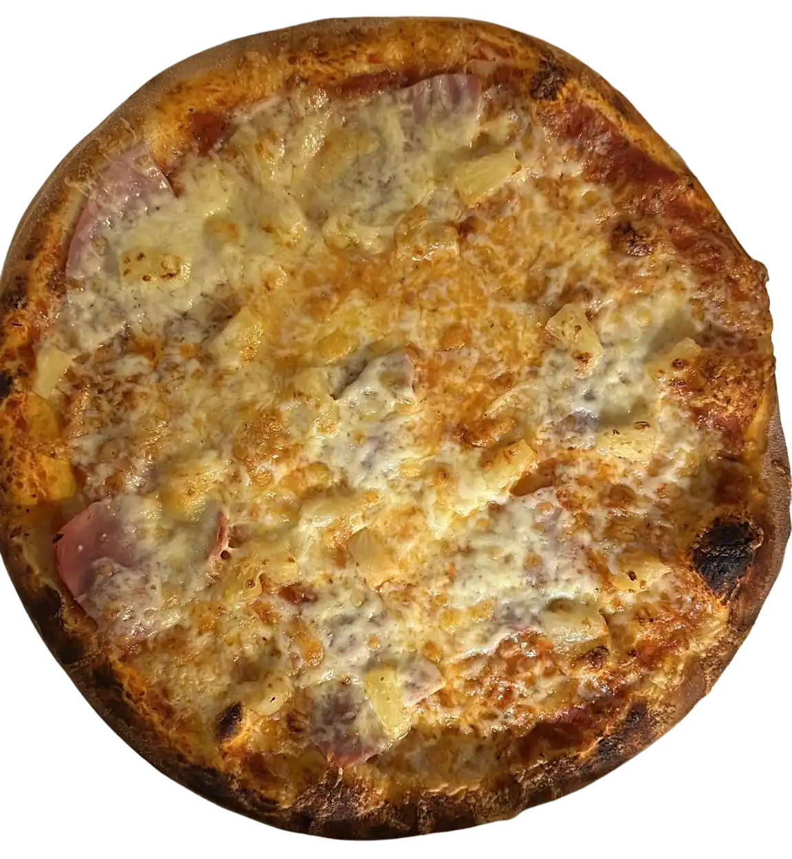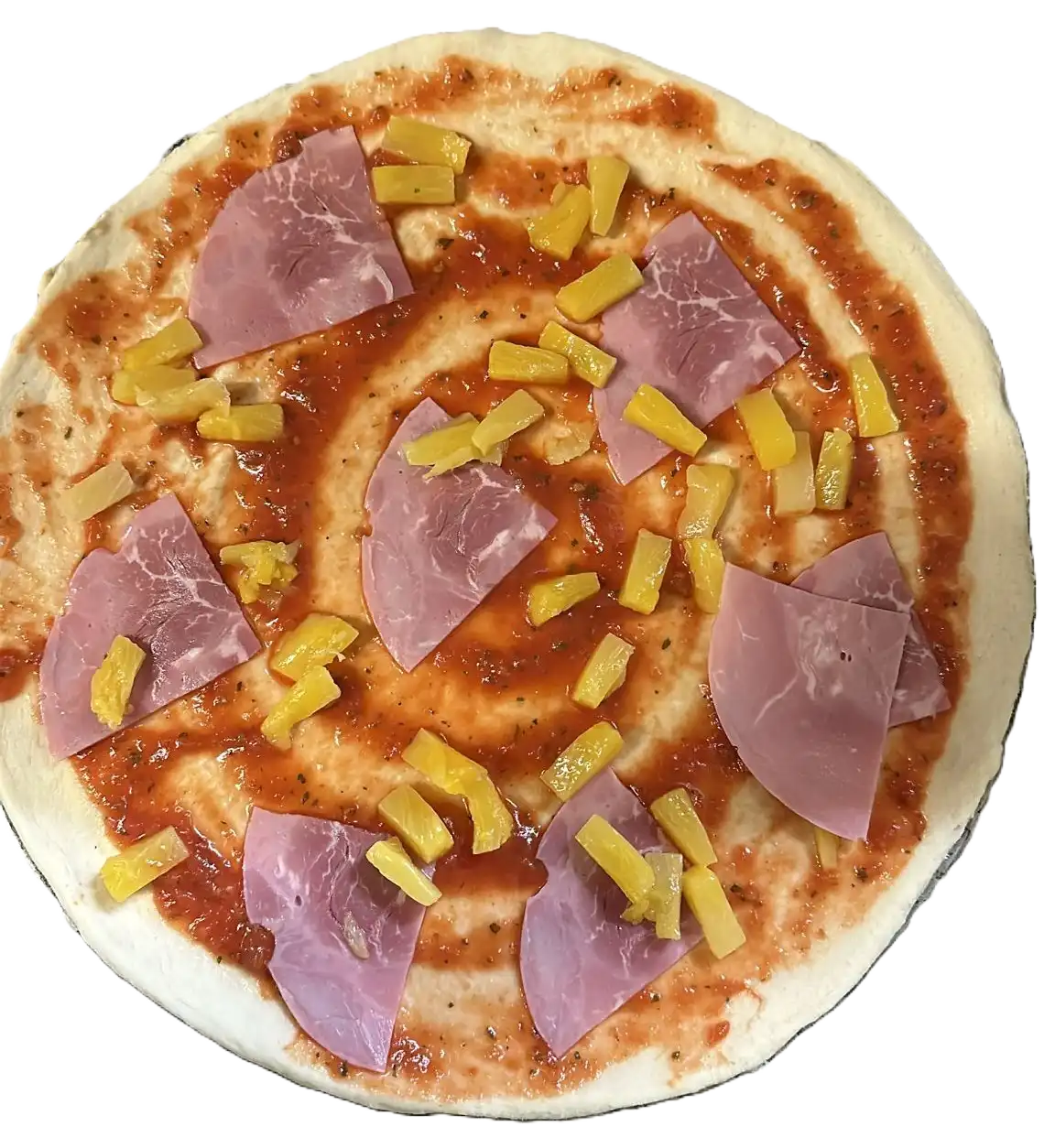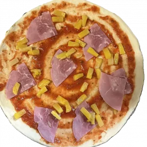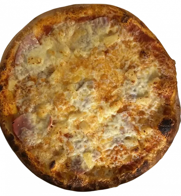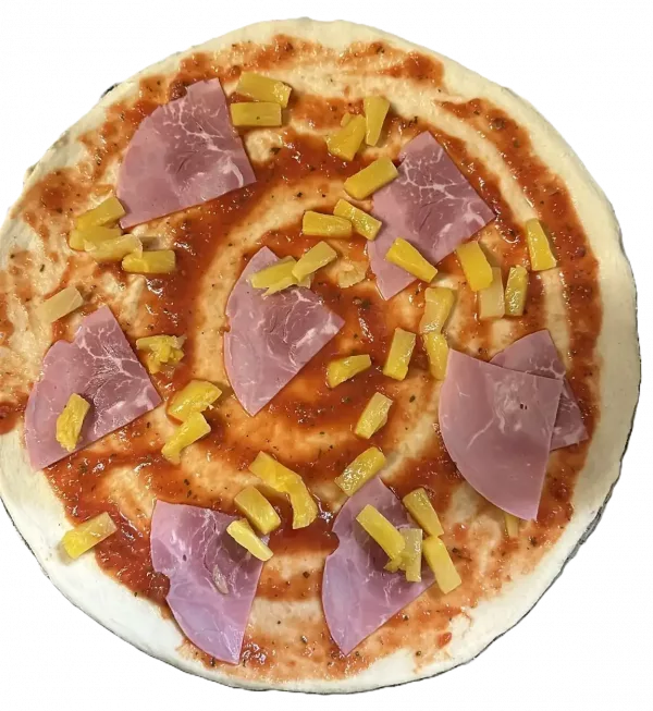 Genießen Sie unsere köstliche Pizza Hawaii mit saftigem Schinken und frisch geschnittenen Ananasstücken. Der knusprige Pizzateig ist perfekt belegt mit einer würzigen Tomatensoße, die durch ihre ausgewogene Gewürzmischung besticht, sowie zarten Scheiben von hochwertigem Schinken und süßen, sonnengereiften Ananasringen. Die harmonische Kombination von salzigem, herzhaftem Schinken und fruchtiger, süßer Ananas verleiht dieser Pizza ein einzigartiges und unverwechselbares Geschmackserlebnis, das sich auf der Zunge entfaltet. Jeder Bissen ist ein wahrer Genuss für die Sinne und transportiert Sie direkt ins Paradies der kulinarischen Köstlichkeiten. Diese Pizza ist die perfekte Wahl für einen unvergesslichen Pizzaabend zu Hause im Kreise Ihrer Familie oder mit Freunden, die Ihren Gaumen verwöhnen möchten. Lassen Sie sich von dieser köstlichen Kombination begeistern und genießen Sie einen unvergesslichen Abend voller Geschmack und Geselligkeit!