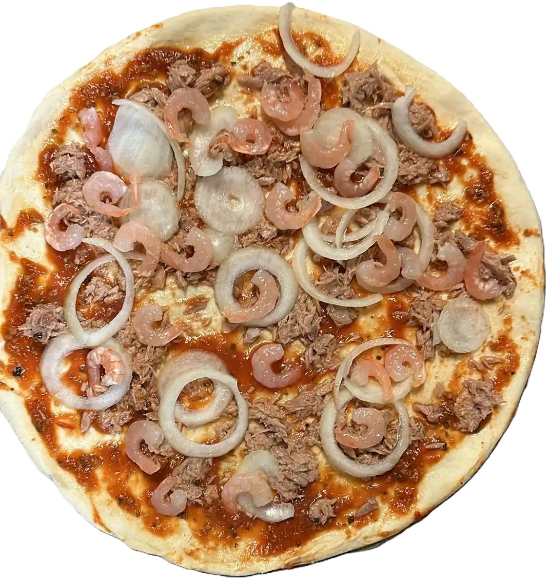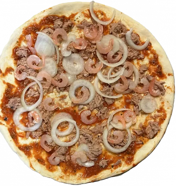 Unsere Pizza Rosa mit Thunfisch, Zwiebeln, Shrimps, Rucola und Oregano ist eine köstliche Kombination aus frischen Zutaten, die zusammen ein unvergleichliches Geschmackserlebnis bieten. Der knusprige Pizzateig, sorgfältig in unserer eigenen Pizzamanufaktur hergestellt, bildet die perfekte Basis für die saftigen Thunfischstücke, die zarten, perfekt gegarten Shrimps und die würzigen, aromatischen Zwiebeln.